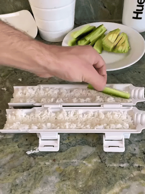 🍣 Solo llena el cilindro con arroz, añade tu relleno favorito, cierra, presiona y obtén un cilindro de sushi listo para cortar